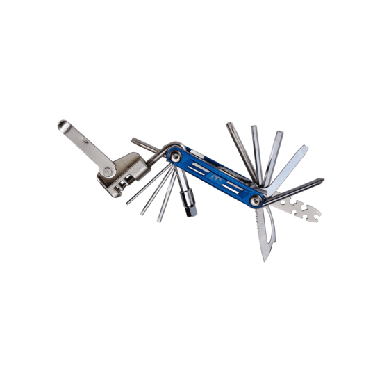 Si vous êtes particulièrement attentif à votre atelier mobile, nous vous proposons la gamme PrimeFold. Un multi-outil bleu compact et léger dans un boîtier en aluminium anodisé. Les outils sont simplement un peu plus longs et fabriqués en matériel chromé. Cela augmente la solidité et permet d'appliquer plus de force. Disponible en quatre versions différentes avec un maximum de 18 fonctions.