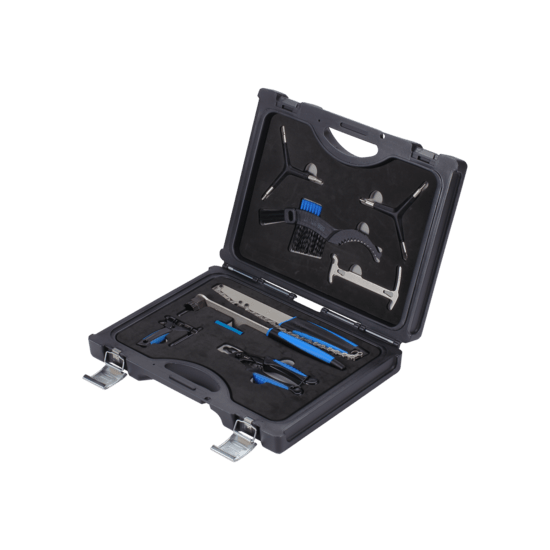 Le kit pour chaîne et cassette contient tous les outils dont vous pouvez avoir besoin pour travailler sur ces éléments. De l'entretien au remplacement des pièces. Cette boîte à outils pratique et luxueuse protège les outils et les ordonne de manière à ce que vous ayez toujours ce qu'il vous faut à portée de main !